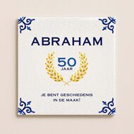 Het tegeltje heeft een klassieke uitstraling met een moderne twist. De combinatie van een elegant ontwerp, duidelijke typografie en een feestelijke lauwerkrans maakt het een echte blikvanger. In het midden staat het getal 50 jaar, omringd door een gouden lauwerkrans die symbool staat voor eer, trots en prestatie. Bovenaan staat de naam Abraham, en onderaan de vrolijke tekst: “Je bent geschiedenis in de maak!”